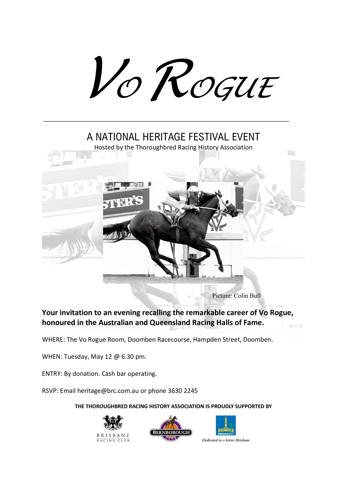 The Thoroughbred Racing History Association is again taking part in the Australian Heritage Festival. This year we will hold our function in the Vo Rogue Room at Doomben racecourse on the evening of Tuesday, May 12.